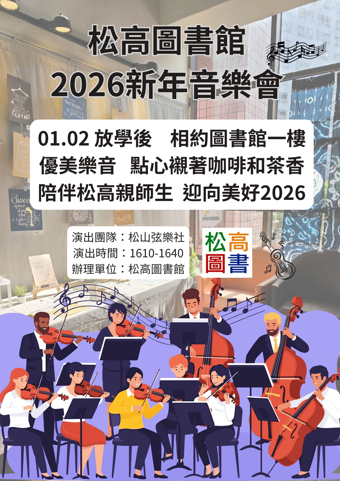 圖書館舉辦新年音樂會,邀請全校師生到圖書館一樓聆聽及享受天籟樂音,迎接2026美好的一年。