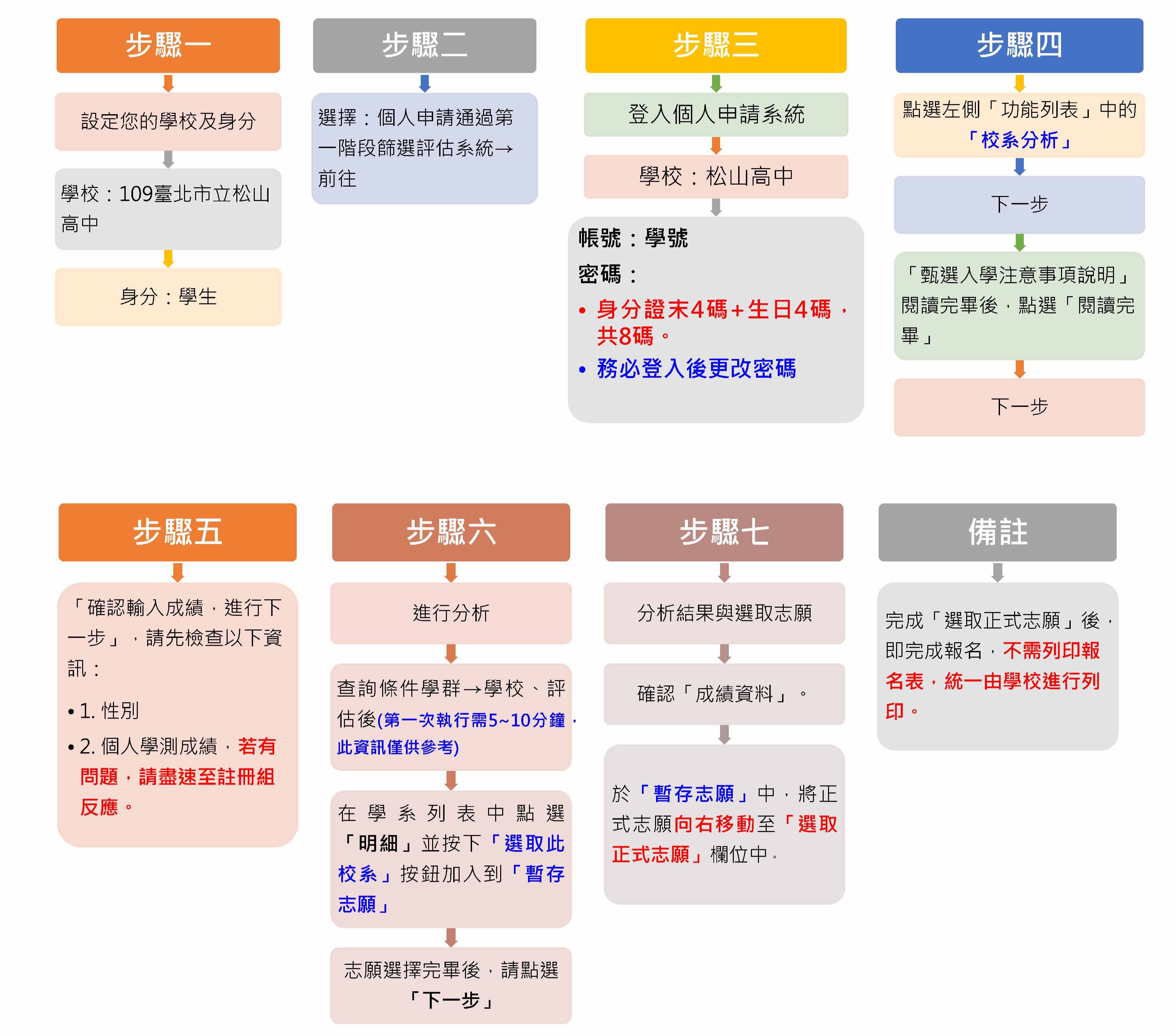 說明:大學得限制考生申請該校之學系(組)數,違者取消考生報名該大學所有校系(組)之申請,詳見個人申請簡章頁(4)-(8)。如臺灣大學個人申請僅可選填5個學系數、政治大學僅可選填3個。