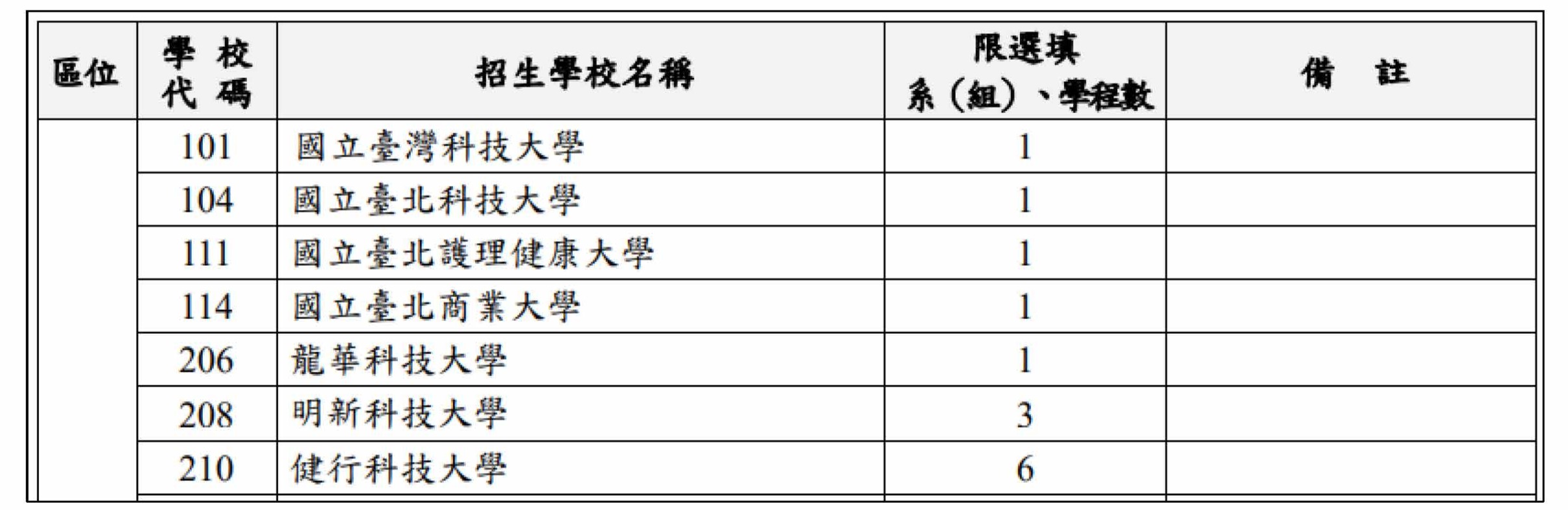 (二)各校得限制申請生可申請該校之系(組)、學程數,一覽表之「限選填系(組)、學程數」欄,表示申請生可申請該校之系(組)、學程數。詳見四技申請簡章頁IX-X。如: