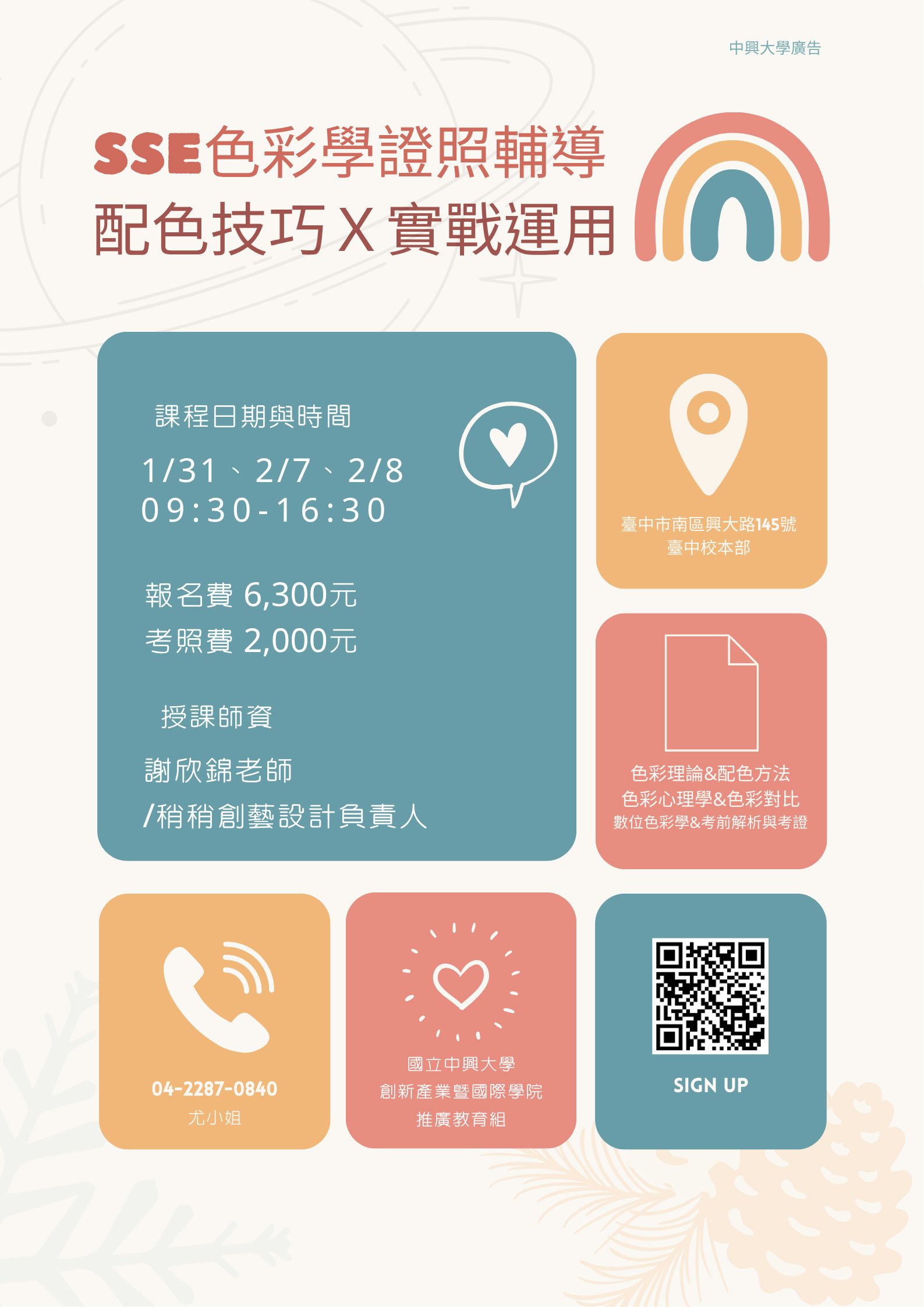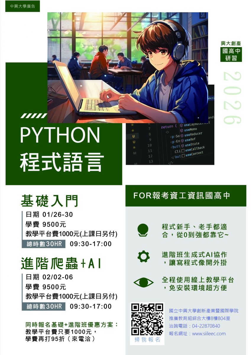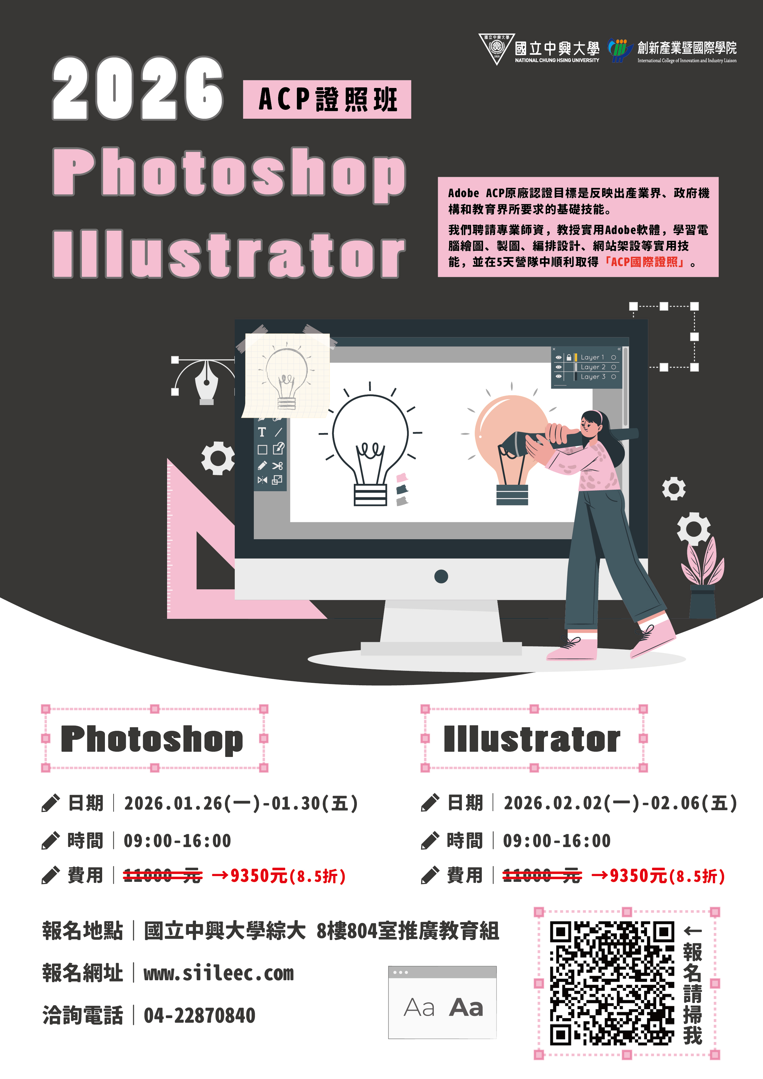 國立中興大學寒假將推出多項特色營隊,包含 Python 程式設計、Adobe ACP 證照輔導、SSE 色彩學證照課程,以及 AI 創作與探索活動,歡迎國高中生踴躍參加!