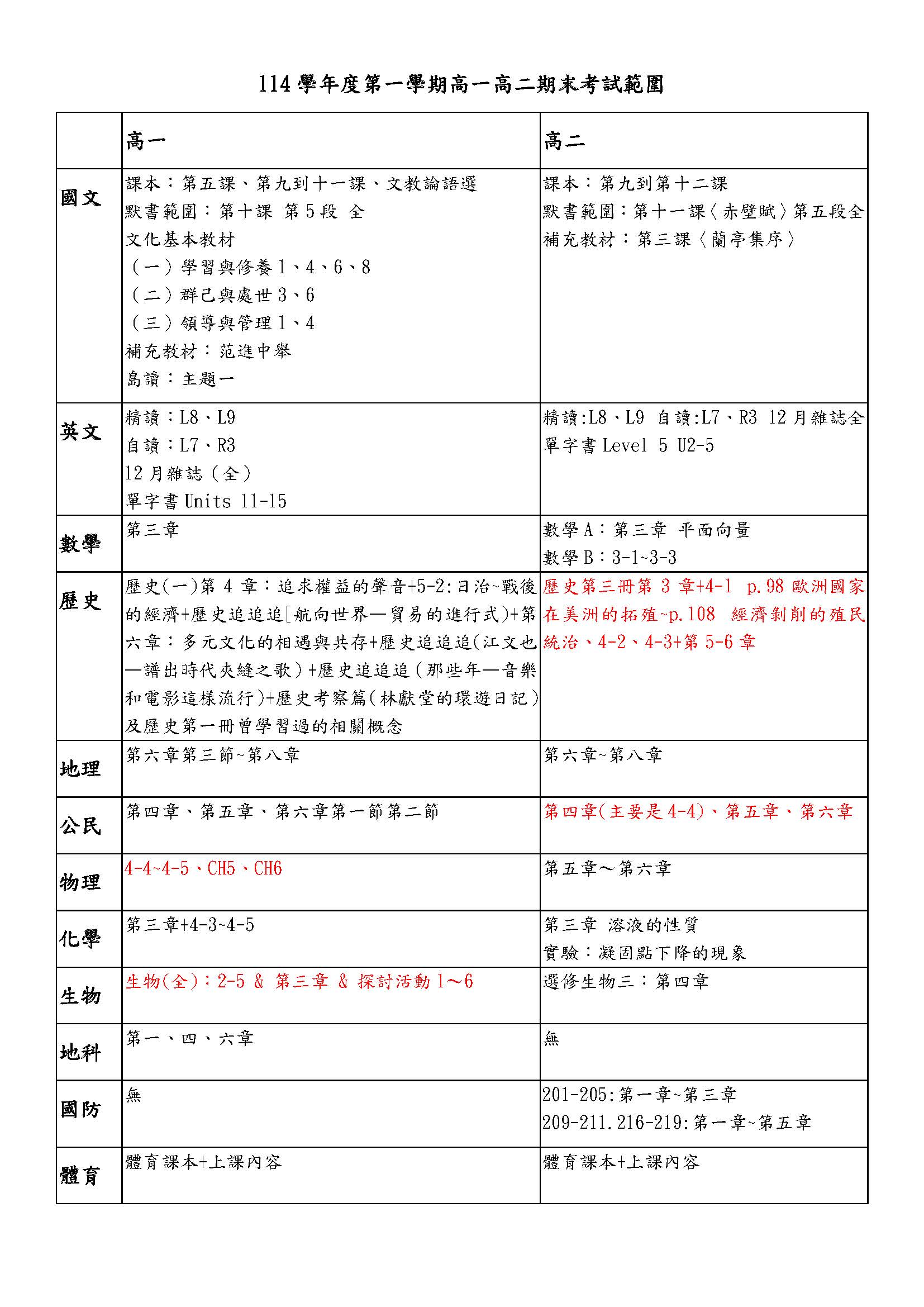 01/10更新高一物理考試範圍01/12更新高一生物考試範圍