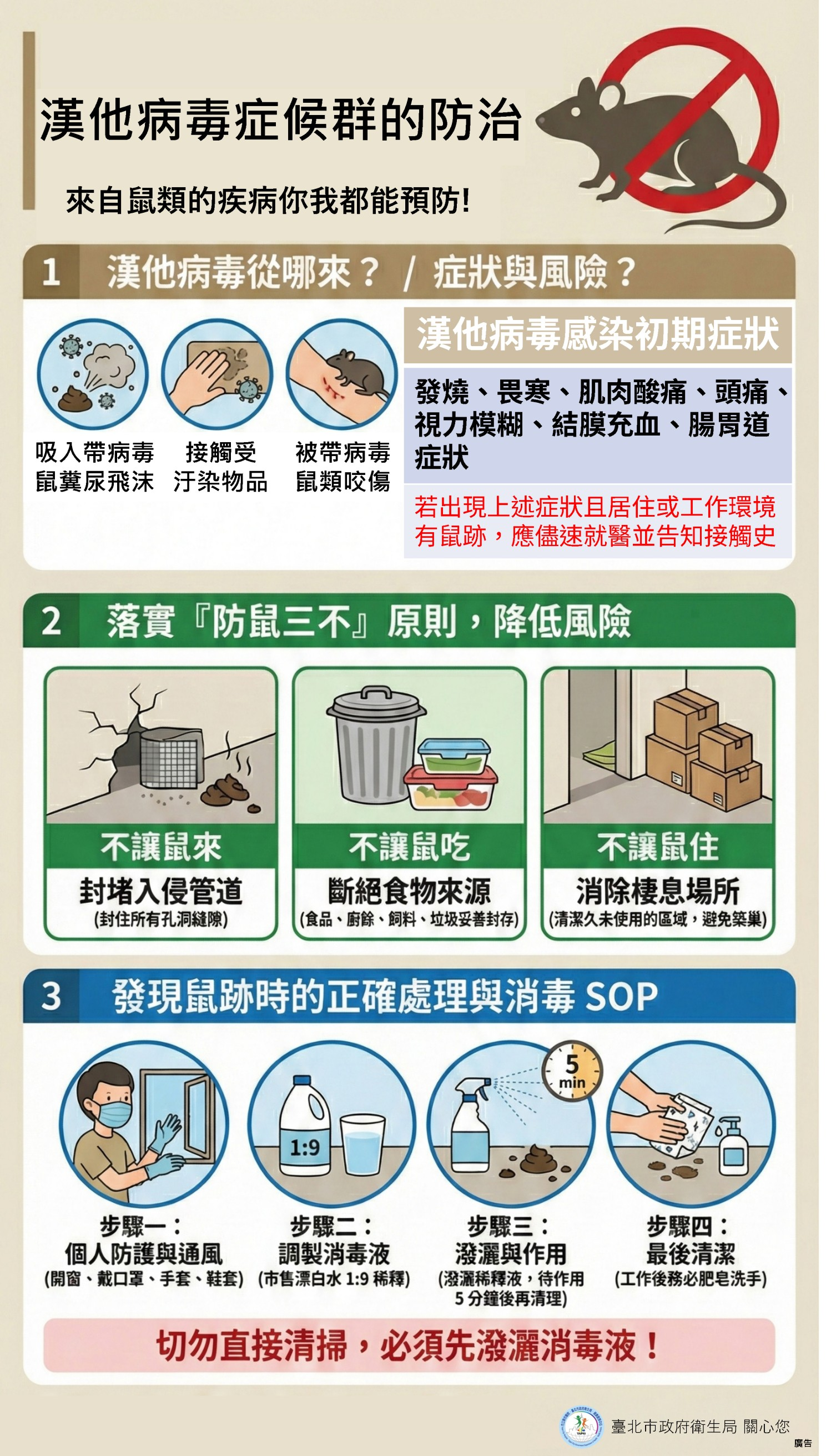 【漢他病毒 防疫通知 🐭】 📍 因應北市漢他病毒疫情,請各單位落實「防鼠三不」:清廚餘、封孔道、除雜物。📍 環境清消請至健康中心領取稀釋漂白水,作業時請戴口罩與手套 😷。📍 發現鼠跡請通報總務處或衛生組。請務必通報,以利鼠況掌握。