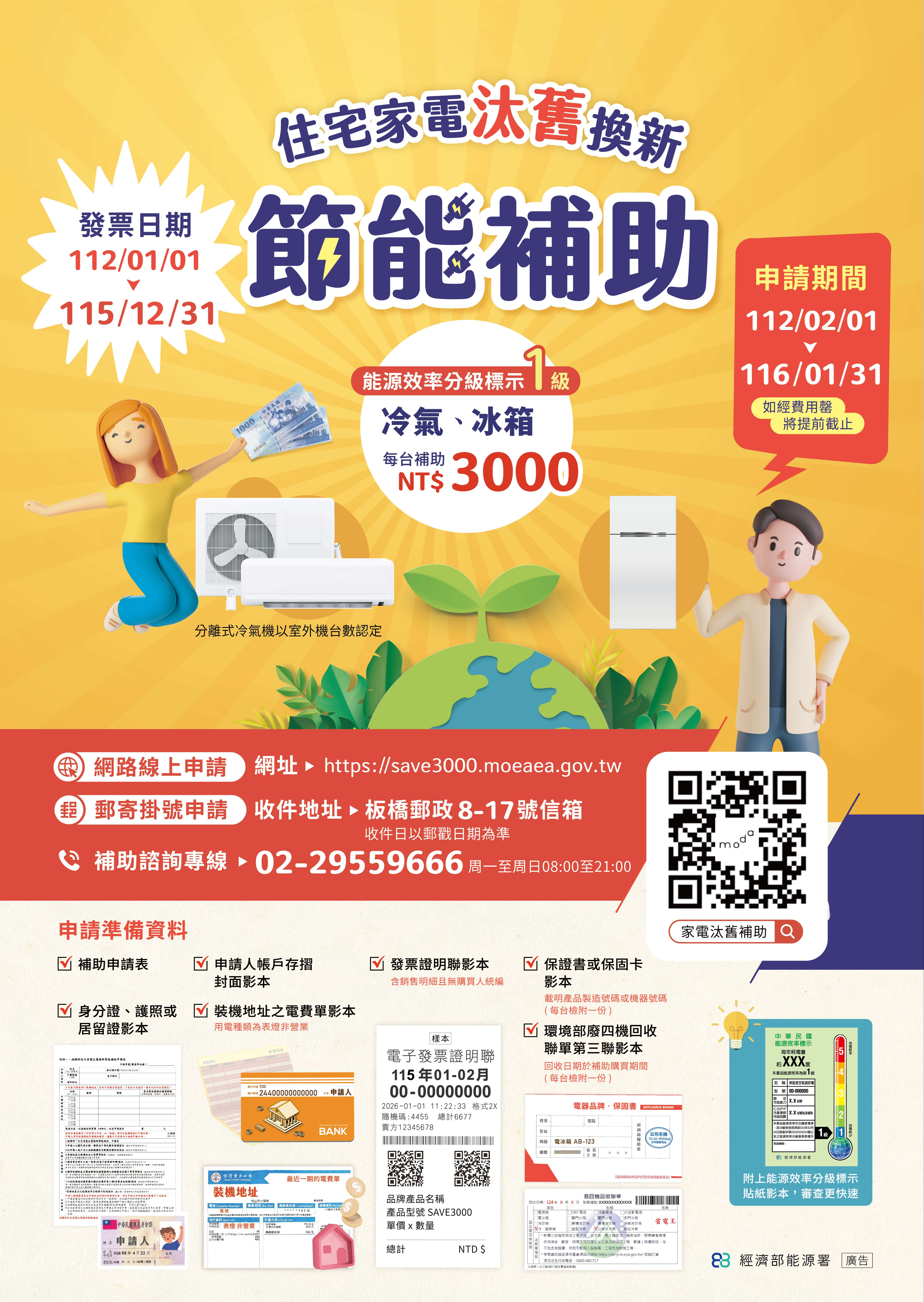 經濟部鼓勵住宅冷氣、冰箱汰舊換新,一級能效產品每台補助3,000元,補助購買期間至115/12/31,詳情請搜尋「家電汰舊補助」。