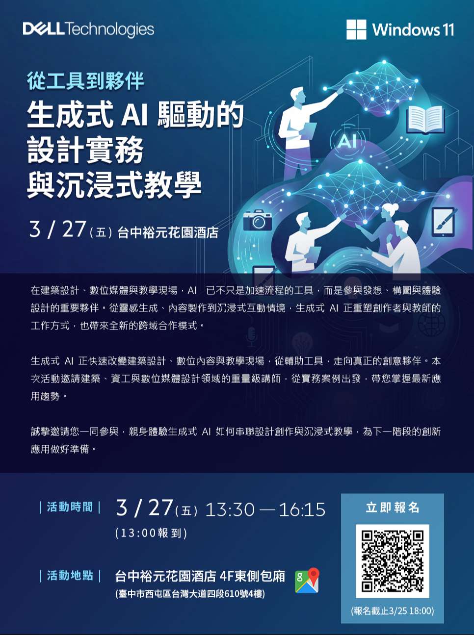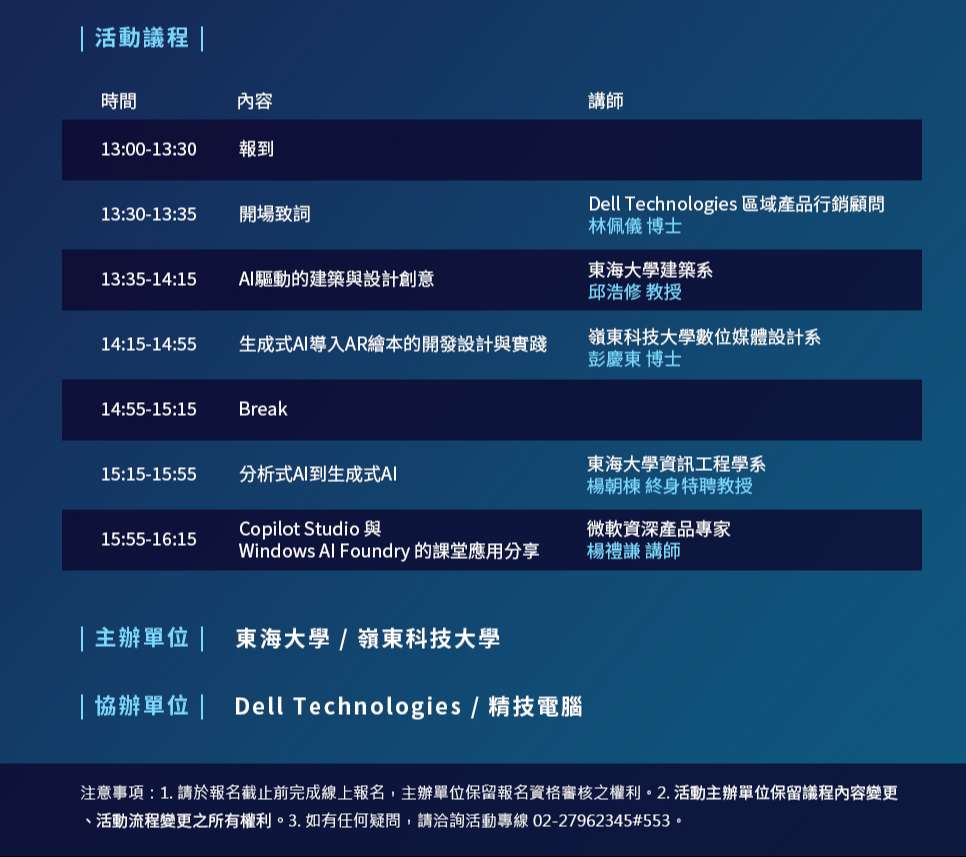 一、東海大學與Dell、Microsoft及精技電腦公司合辦「生成式AI驅動的設計實務與沉浸式教學」活動,分享生成式AI於建築設計、數位媒體、AR繪本、Copilot Studio及Windows AI Foundry等教學與實務應用。