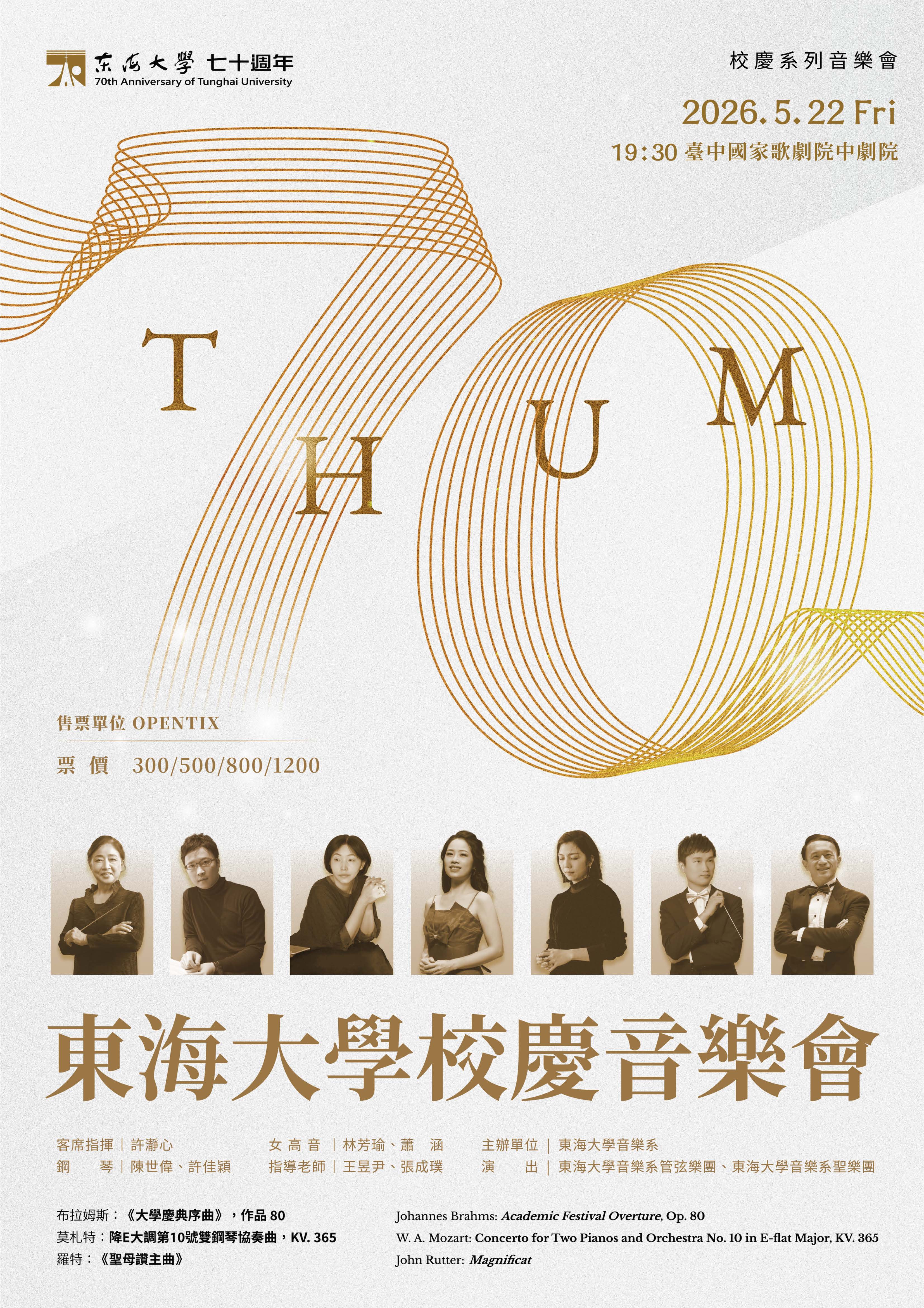 八、本校音樂學系另於115年5月22日(星期五)19:30,假臺中國 家歌劇院中劇院舉辦「東海大學校慶音樂會」,隨函附上 活動海報及訂票單。如需購票可將填好之附件訂票單以電子郵件傳送至jotzuliao@thu.edu.tw或電洽04-23590121分 機38202廖小姐,活動海報亦請協助公告。